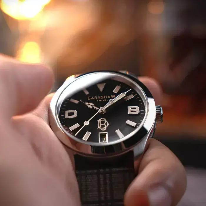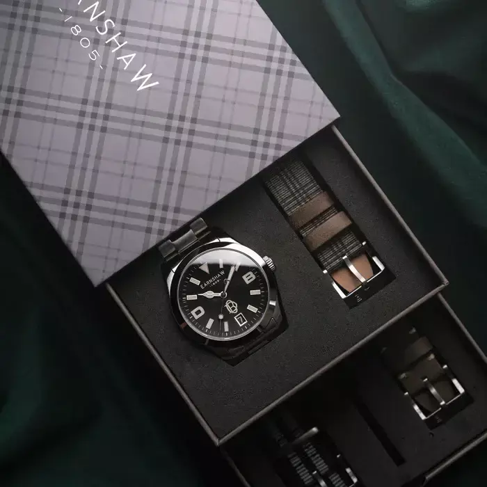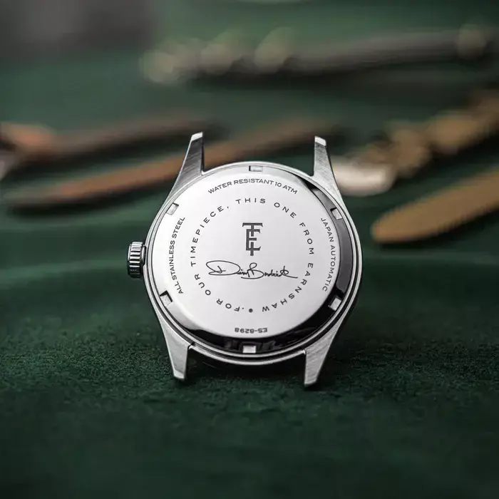 Uma gravação personalizada no fundo da caixa com a nota pessoal de Damien: "Para o nosso relógio, este da Earnshaw" acrescenta um toque atencioso e pessoal.