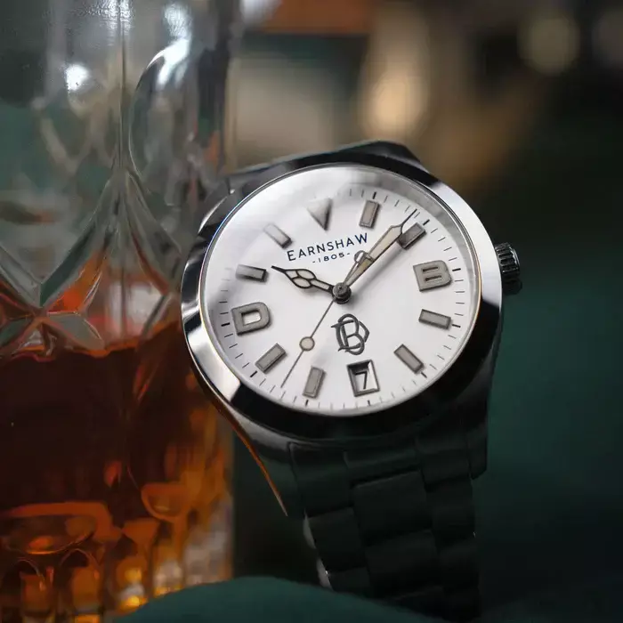 Uma gravação personalizada no fundo da caixa com a nota pessoal de Damien: "Para o nosso relógio, este da Earnshaw" acrescenta um toque atencioso e pessoal.