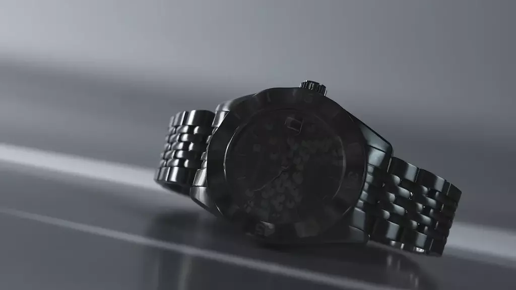 Um mostrador assombrado em cinza. 50 fantasmas brilhantes deslizam pelo mostrador, acompanhados por ponteiros e índices em brasa com lume. Uma luneta escovada com efeito sunray coroa a caixa e uma nova pulseira metálica e uma correia selam o pacto.