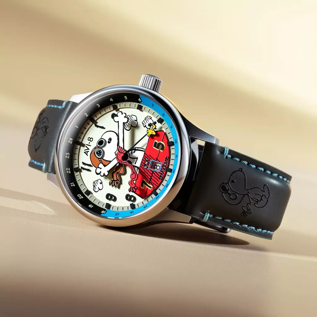 Movimento automático GMT, mostrador com lume brilhante, pata do Snoopy na coroa e fundo de caixa de exposição. A aviação encontra a imaginação.